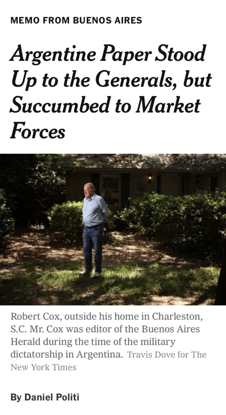 The following news article regards the closing of the Buenos Aires Herald, a local newspaper that spoke out against Argentina's last military dictatorship when Robert Cox was its editor. Cox read some of my creative non-fiction stories from my interviews with children of the Desaparecidos and encouraged me to keep writing. His words inspired my debut novel.